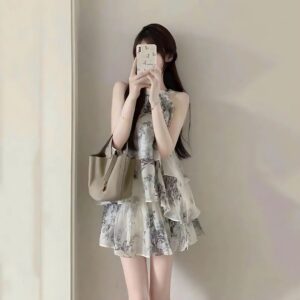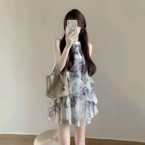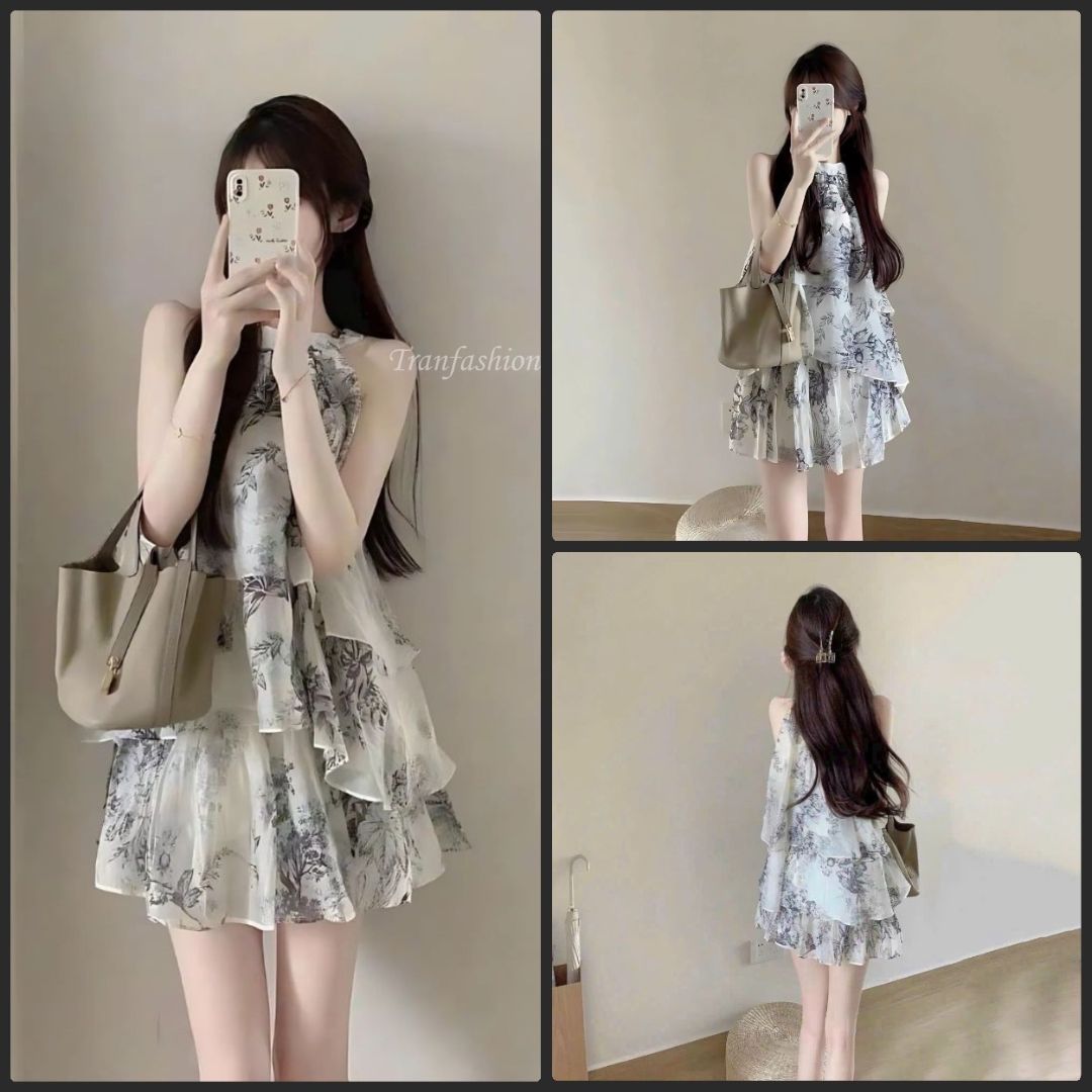 Đầm váy nữ áo 2 dây cổ yếm kèm chân váy 3 tầng form dáng xoè xếp ly xinh xắn dành cho nàng diện đi chơi